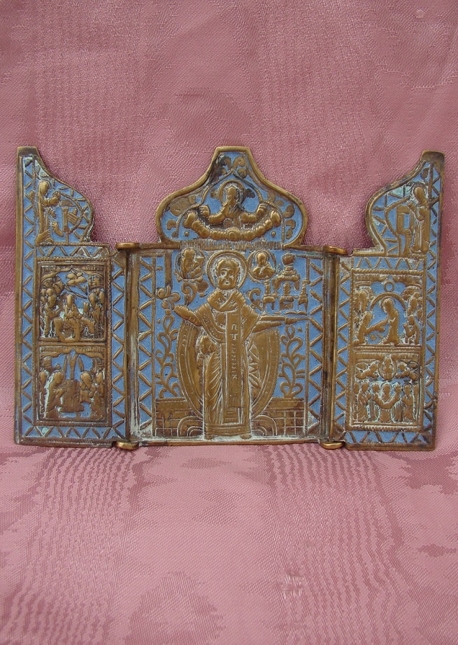 Triptychon Heiliger Nikolaus von Moshajsk.Auf den Flügeln 4 Festtage.Blaues Email.Geöffnet 10x14,2cm.Russisch,um 1800.