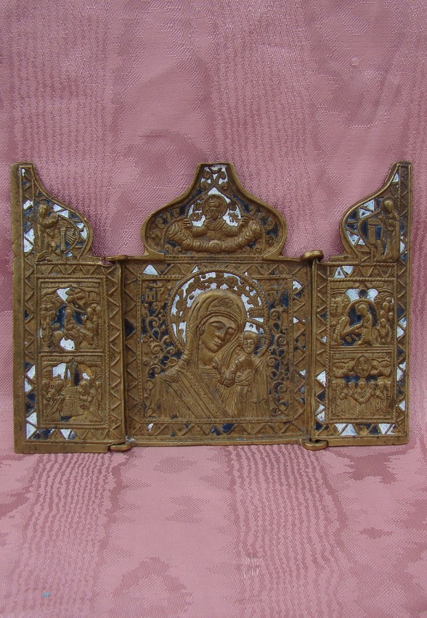 Triptychon Gottesmutter von Kasan.Auf den Flügeln 4 Festtage.Mehrfarbiges Email.Russisch,19.Jahrhundert.Geöffnet 11x15cm.