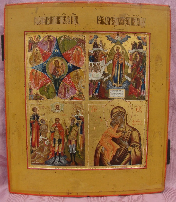 | Vierfelderikone Gottesmutter im brennenden Dornbusch,Gottesmutter Trösterin der Leidenden,5 Heilige unter Christus und die Gottesmutter Feodorowskaja.Russisch (Malerdorf Palech),um 1830.Feinte Malerei.Nur minimale Restaurierungen.35x30cm.Sammlerstück! |