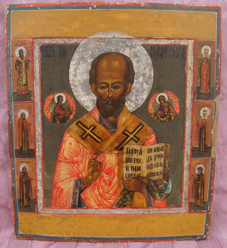 Heiliger Nikolaus mit 6 Randheiligen.Russisch,um 1850.Kleine Randschäden,sonst gut erhalten.35x31cm.