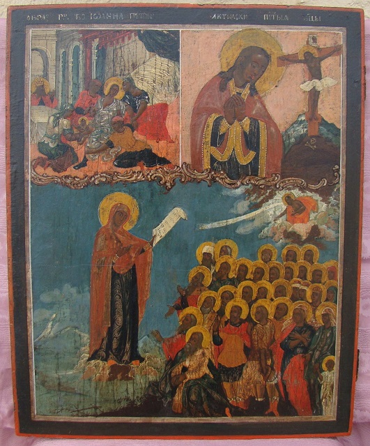 Dreifelderikone.Russisch,18.Jahrhundert.Gottesmutter Bogoljubskaja,Geburt der Gottesmutter,Gottesmutter Achtyrskaja.52x42cm.