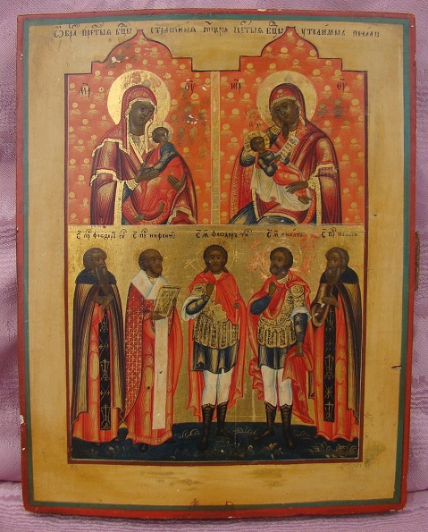 Dreifelderikone mit 2 Gottesmutter Darstellungen und vielen Heiligen.Russisch,19.Jahrhundert.Feine Qualität der Malerei.23x18cm.