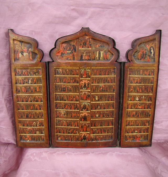 Jahres Triptychon mit Szenen aus dem Leben Christi und Festtagsszenen.Nordrussisches Altgläubigen Atelier,um 1800.Geöffnet 40x47cm.Museales Sammlerstück! Expertise Ikonenmuseum Schloss Autenried.