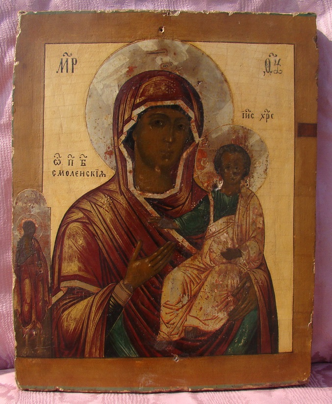 Gottesmutter von Smolensk.Auf dem Rand ein nicht mehr identifizierbarer Heiliger.Zentralrussisch,19.Jahrhundert.31x24cm.Gut erhalten.
