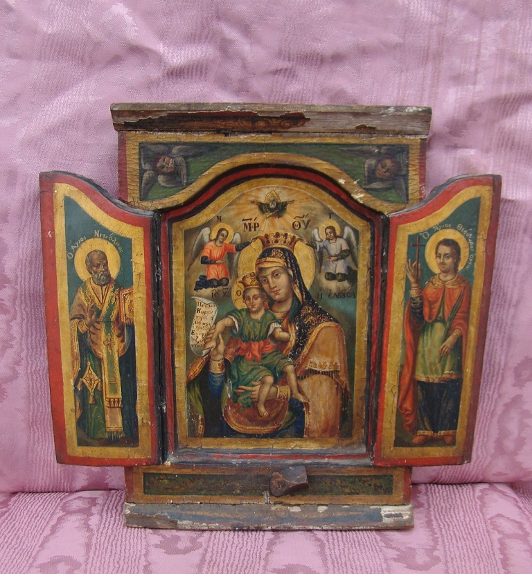 Triptychon.Griechisch,19.Jahrhundert.Aufgeklappt 27,5x26,5cm.Mittelteil mit der Gottesmutter Portatissa.Auf den Fügeln Heiliger Nikolaus & Heiliger Theodoros.Gute Qualität der Malerei.Originaler Zustand.