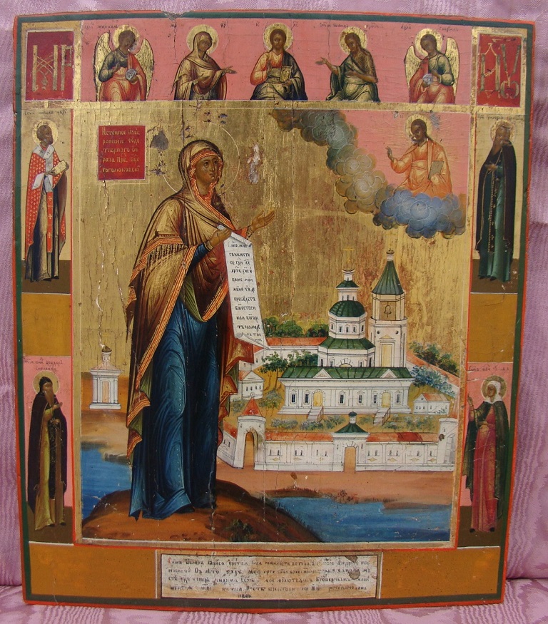 Gottesmutter Bogoljubskaja mit der Klosteranlage des Fürsten Andrej.Russisch,19.Jahrhundert.31x26,5cm.Auf dem Rand 4 Heilige.Sehr seltene Darstellung.Sammlerstück.Die mitgelieferte Expertise enthält alle übersetzten Inschriften.