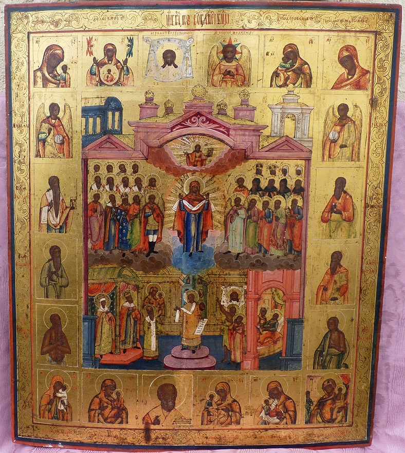 Gottesmutter Pokrow umgeben von 20 Heiligendarstellungen.Russisch (Schule von Neviansk),19.Jahrhundert.Grösse 62x54cm.Äußerst dekorative und reichhaltige Ikone.