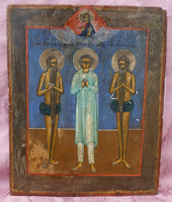 Drei selten dargestellte Heilige.Petrus von Athos,Artemios,Onouphrios.Russisch,19.Jahrhundert.27x22cm.