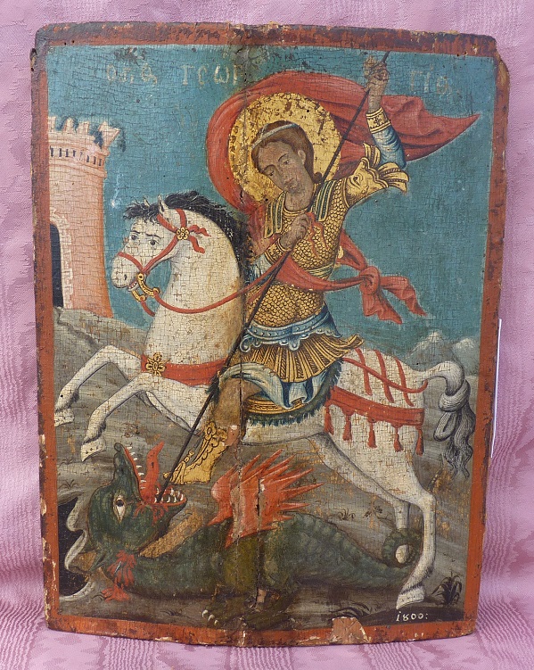 Heiliger Georg,den Drachen tötend.Griechisch,datiert 1800.Originaler Zustand.34x25,5cm.Sammlerstück!