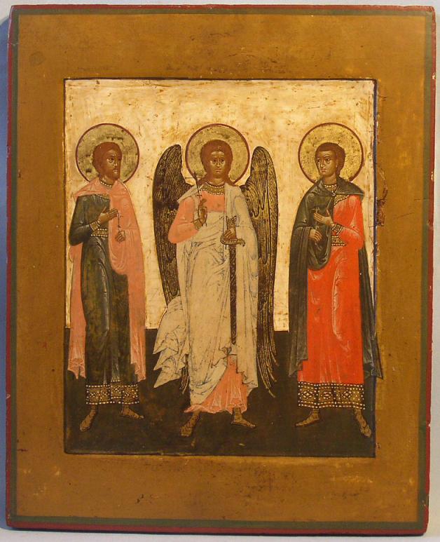 Heiliger Schutzengel mit Florus & Laurus.Russisch,um 1800.33x27cm.Freigelegter Hintergrund.