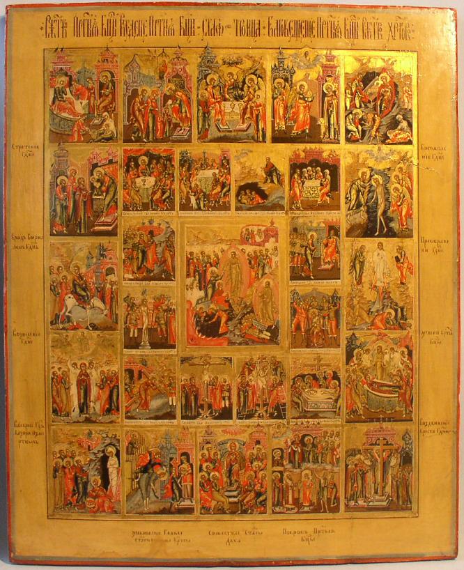 Erweiterte Festtagsikone.Russisch (Palech),Anfang 19.Jahrhundert.52x43cm.Hervorragendes Sammlerstück!