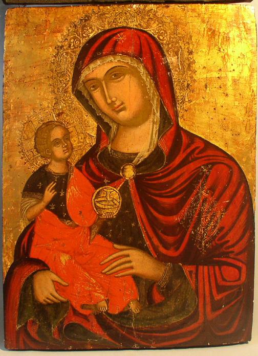 Gottesmutter della Consolatione.Griechisch-adriatisch,16.Jahrhundert (um 1580).47x35cm.Vergoldetes Silberoklad des 19.Jahrhundert.Griechische Silberoklade sind selten und wurden nur für besonders verehrte Ikonen angefertigt.Sammlerstück!