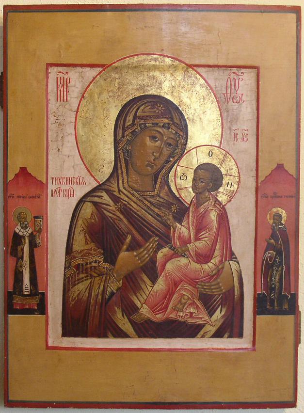 Muttergottes von Tichvin.Russisch,19.Jahrhundert.2 Randheilige.Freigelegter Hintergrund.