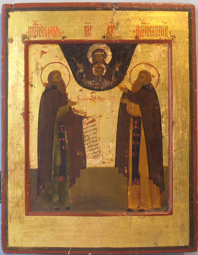 Zosima und Sawatij.Nordrussisch,um 1600.30x24cm.Darüber der segnende Christus.Gut erhaltene Ikone der berühmten Klostergründer.