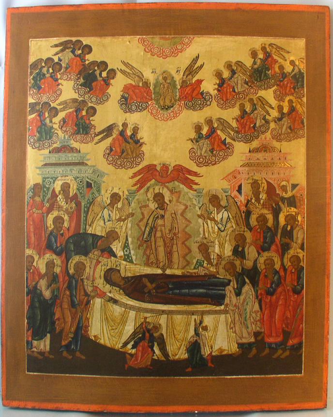 Tod der Gottesmutter mit Herbeieilung der Heiligen.Russisch,um 1800.91x74cm.Riesige dekorative Ikone-Sammlerstück!