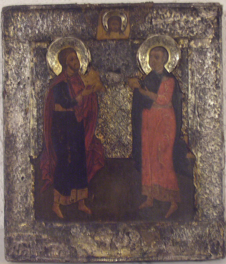 2 Heilige unter dem segnenden Christus.Russisch (Moskauer Schule),Anfang 17.Jahrhundert.Mit originalem Silber Beschlag.32x27cm.
