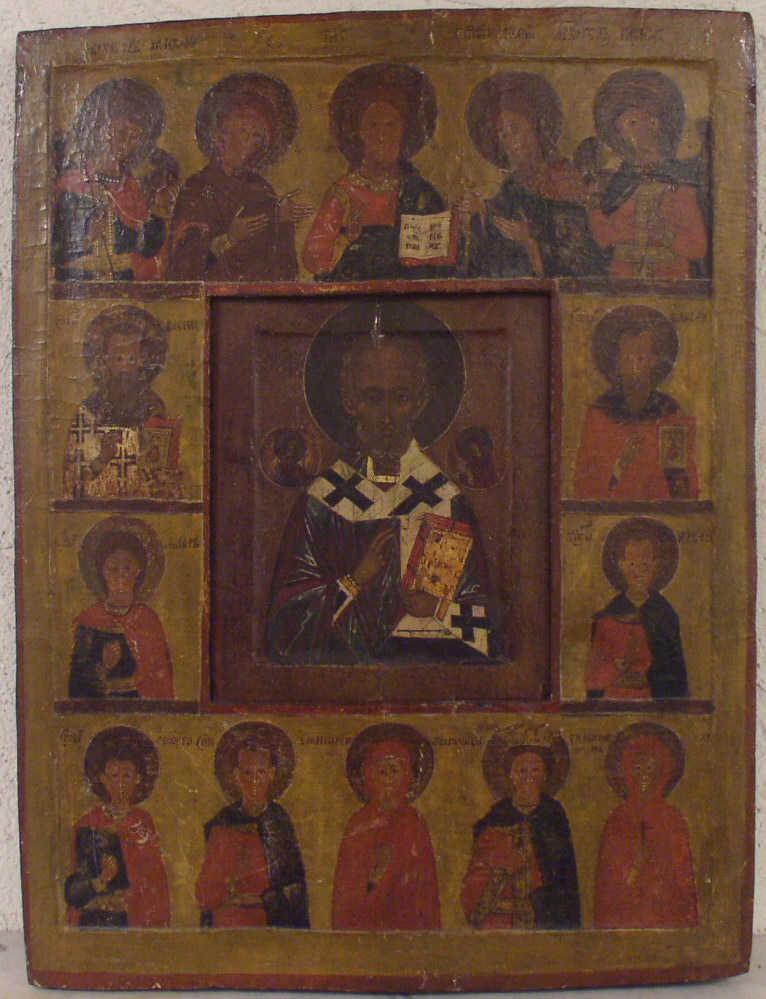 Heiliger Nikolaus umgeben von Heiligen.Nordrussisch,16./17.Jahrhundert.Die innere Nikolaus Ikone dürfte älter sein und wurde wohl durch die Aufnahme in eine grössere Ikone geehrt.65x50cm.Seltenes Sammlerstück!