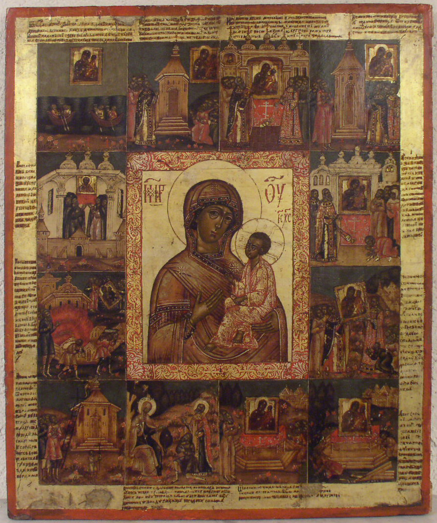 Gottesmutter von Tichvin mit Ihrer Legende / Entstehungsgeschichte.Russisch,17.Jahrhundert.72x60cm.In diesser Grösse ein sehr seltenes Sammlerstück!