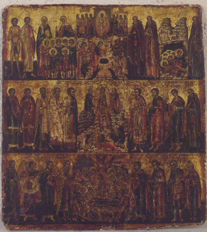 Doppelseitige Monatsikone für den August.Sogenanntes Tabletki.Russisch (Moskauer Schule),17.Jahrhundert.30x28cm.Zwischen den beiden Malschichten befindet sich nur dicke,feste Leinwand.Äusserst Selten.Qualitätvolles Sammlerstück!