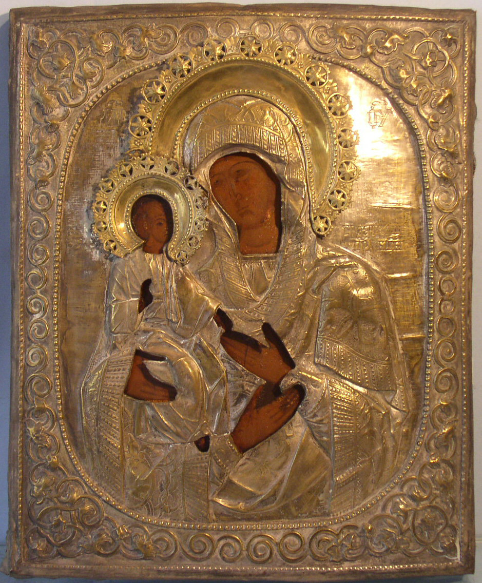 Gottesmutter Tricherusa.Russisch,19.Jahrhundert.42x35cm.Versilbertes Metall Oklad.Grosse dekorative Ikone.