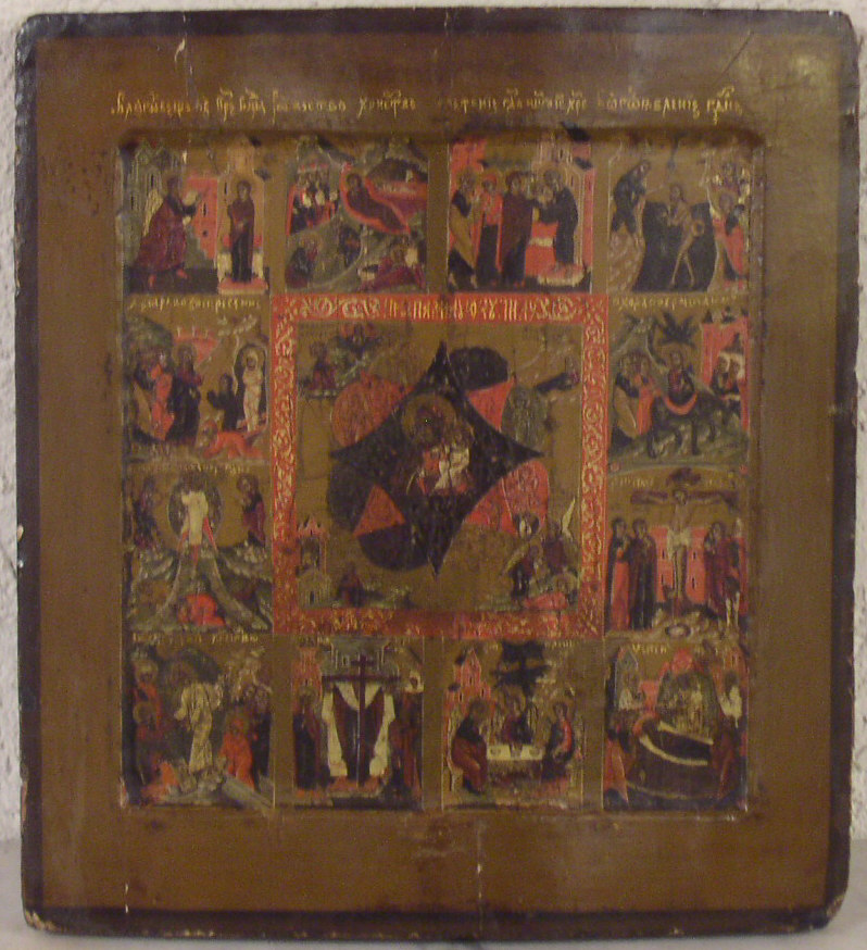 Festtagsikone.Russisch,17.Jahrhundert.35x32cm.Die Besonderheit ist die Muttergottes im brennenden Dornbusch in der Mitte.Seltenes Sammlerstück!