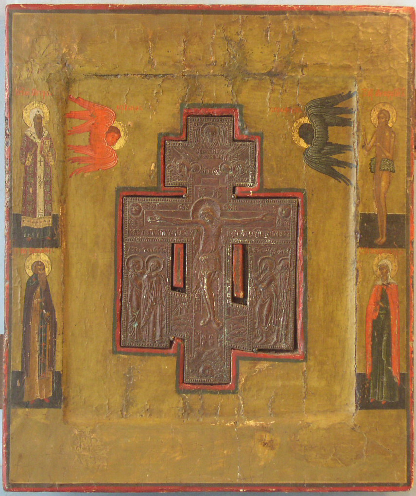 Staurothekikone.Nordrussisch,19.Jahrhundert.Originales Bronze-Kreuz.31x27cm.