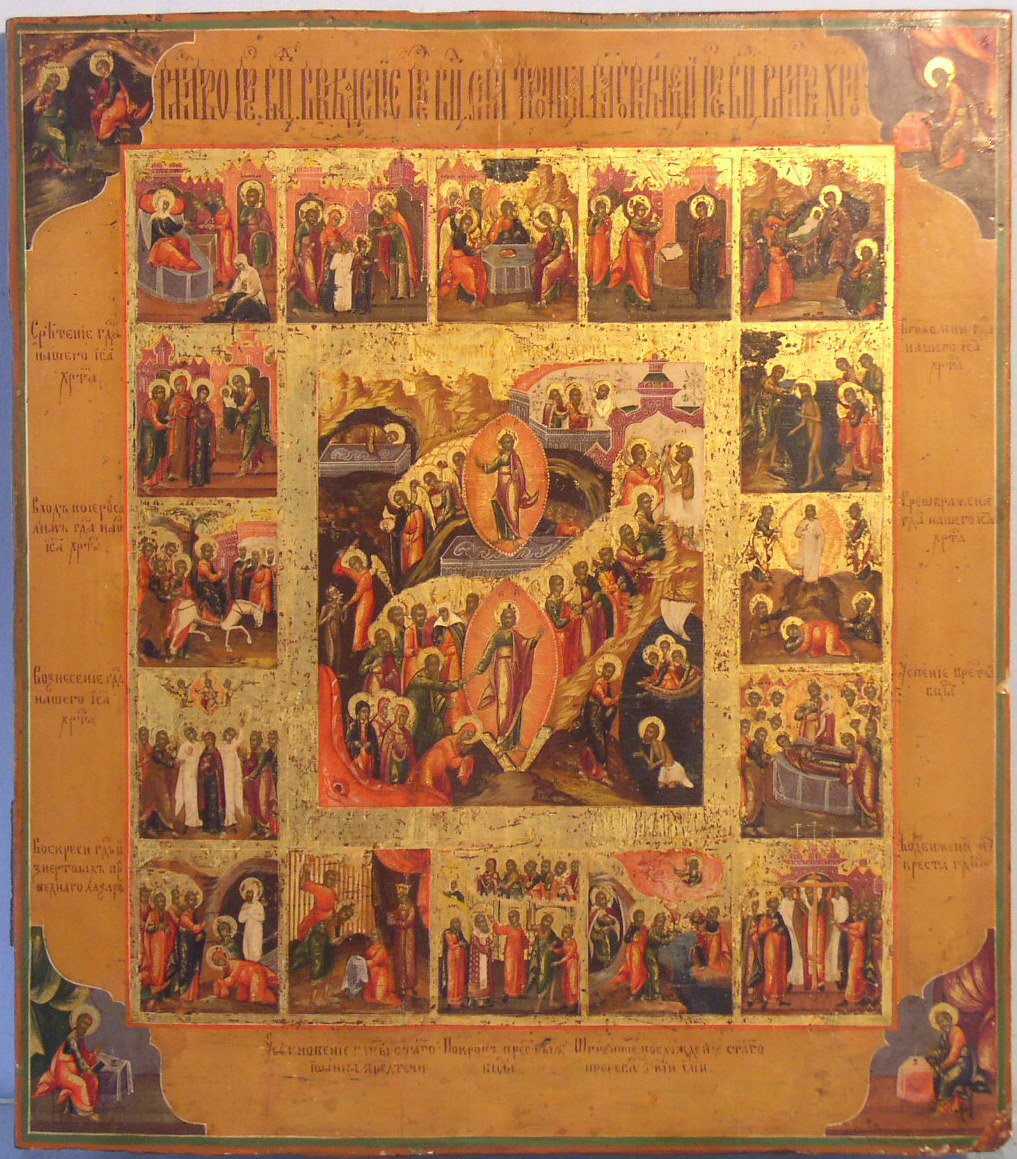 Festtagsikone.Russisch (Palech),19.Jahrhundert.In den Ecken die 4 Evangelisten.35x31cm.Gut erhalten.Sammlerstück!