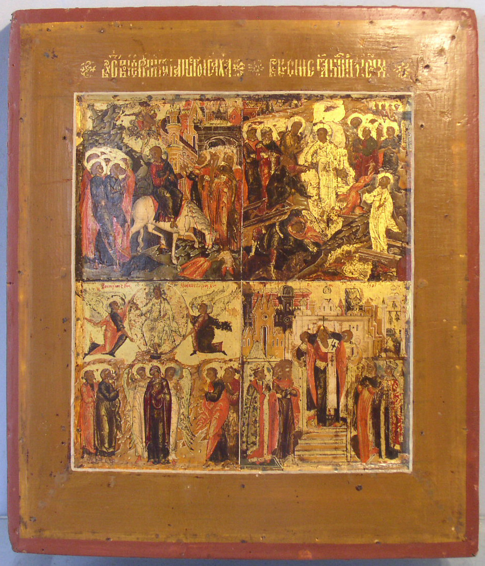Vierfelderikone.Einzug Christi in Jerusalem,Höllenfahrt,Himmelfahrt Christi und Kreuzerhöhung.33x29cm.Sammlerstück von guter Qualität.