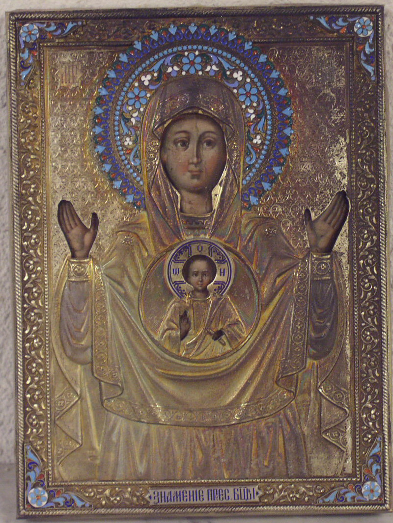 Gottesmutter des Zeichens.Südwestrussisch,um 1890.Silberoklad mit Email des berühmten Pawel Owtschinnikow.Im gestempelten Originalkasten.22x16cm.Sammlerstück!