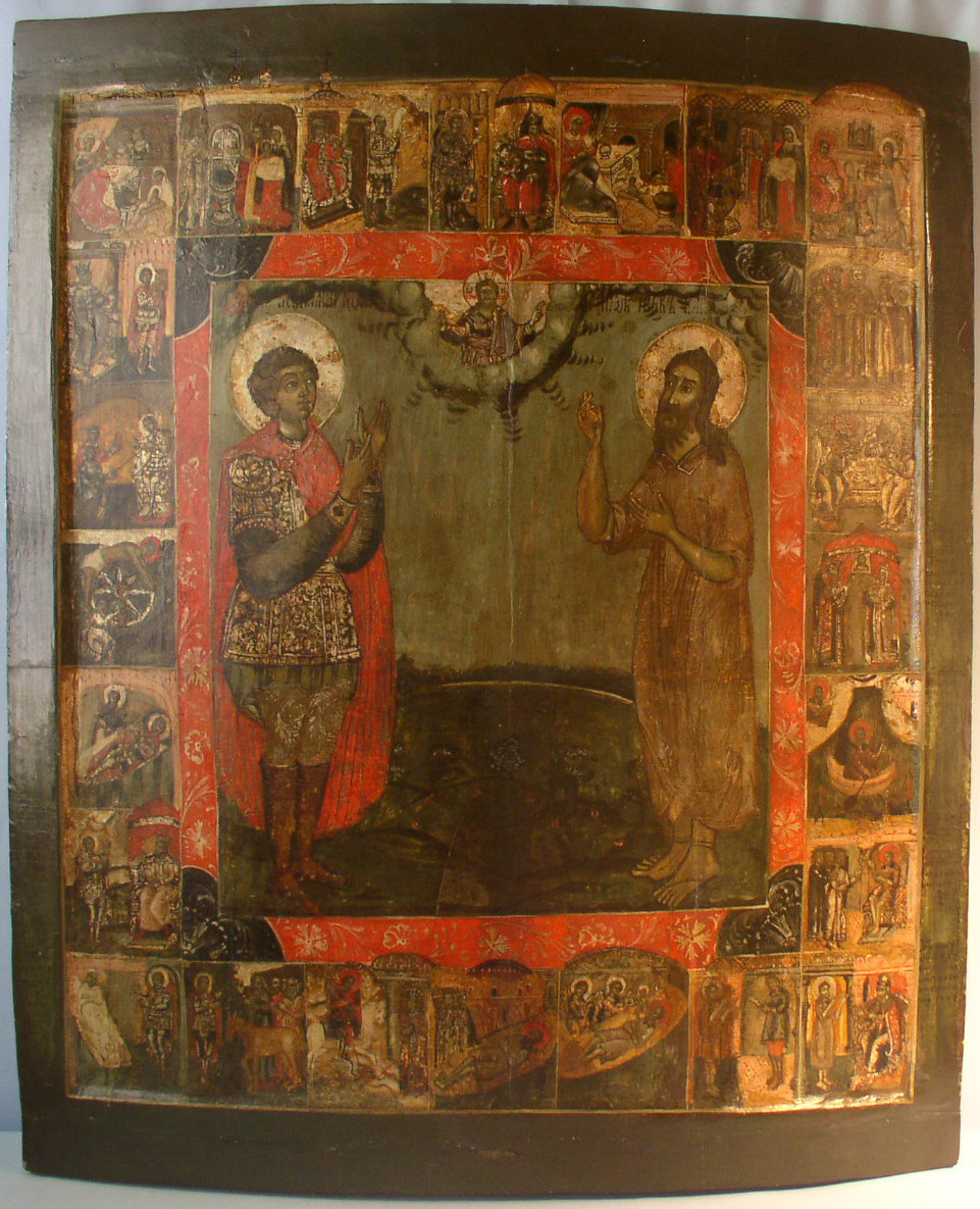 Heiliger Georg und Heiliger Alexej mit Szenen aus ihrem Leben.Russisch,um 1700.97x82cm.Aussergewöhnlich grosse Viten Ikone.Museales Sammlerstück!