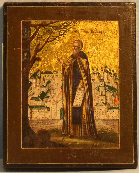 Heiliger Klostergründer (Tychon?) mit einer Klosteranlage.Russisch,19.Jahrhundert (Um 1860).13x11cm.