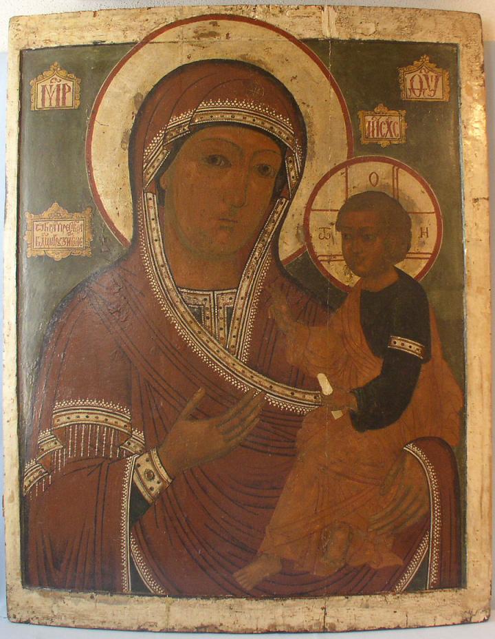 Gottesmutter von Grusinien (Grusinskaja).Russisch,17.Jahrhundert,um 1670.Selten dargestellter Madonnen Typus.110x86cm.Museale Kirchenikone in sehr guter Erhaltung!