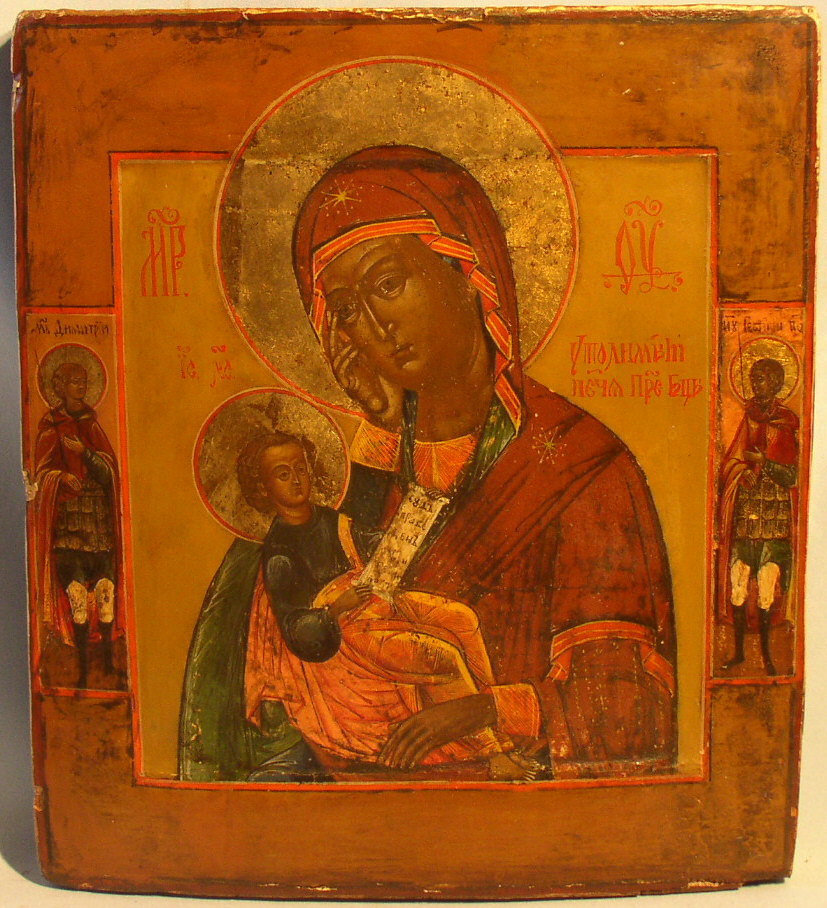 Gottesmutter Lindre meinen Kummer.Auf den Rändern links Heiliger Dimetrius,recht Heiliger Georg.Russisch,19.Jahrhundert (um 1840).30x27cm.