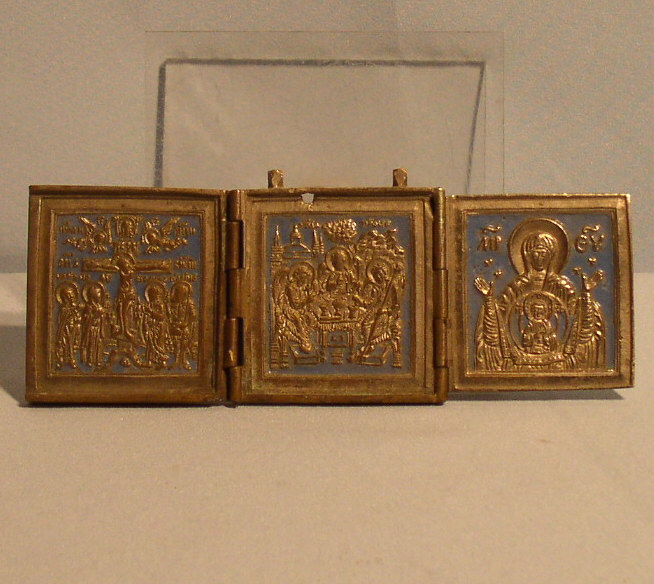 Triptychon mit der Kreuzigung,der östlichen Dreifaltigkeit und der Muttergottes des Zeichens.19.Jahrhundert.Mittelblau emalliert.Versilbert.6,5x16,8cm.