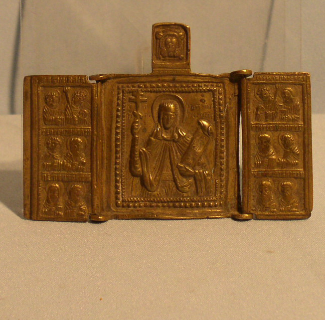 Heilige Paraskeva Triptychon.Darüber Christus.Auf den Flügeln je 6 Heilige.Um 1800.Relativ selten und gut erhalten.6,8x10,2cm.