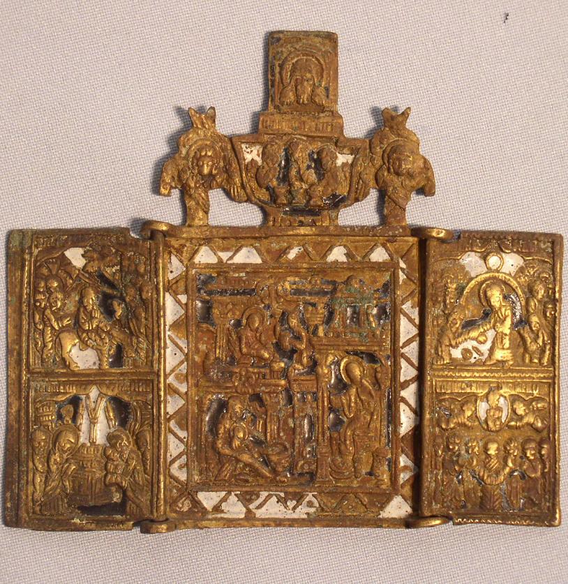 Triptychon mit der Geburt der Gottesmutter in der Mitte unter dem mandylion,der östlichen Dreifaltigkeit und Engeln.Auf den Flügeln 4 Hauptfesttage.2 farbig emailliert.Um 1800.9x10,3cm.Zu jeder Bronze Ikone wird eine Expertise mitgeliefert.