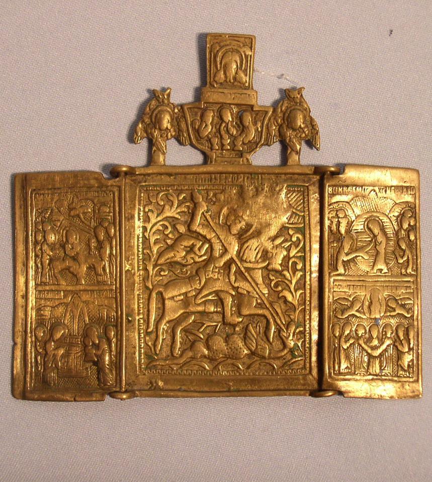 Triptychon mit dem heiligen Georg.Auf den Flügeln 4 Hauptfesttage.19.Jahrhundert.10,2x11,3cm.Gussfehler vor dem kopf des Heiligen Georg.
