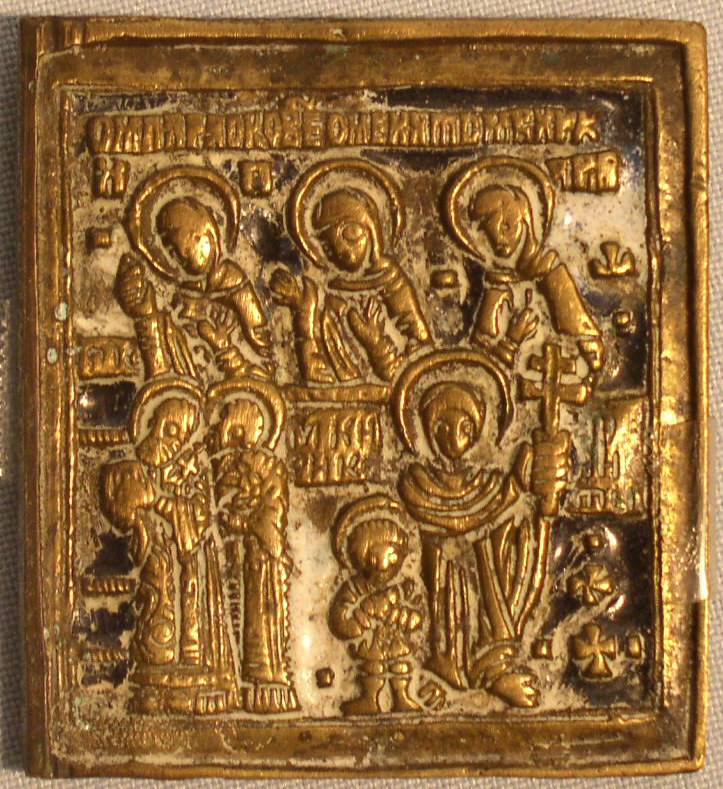 7 Heilige,darunter Julitta und Kirik.2 farbig emailliert.Um 1820.5,1x4,8cm.Zu jeder Bronze Ikone wird eine Expertise mitgeliefert.