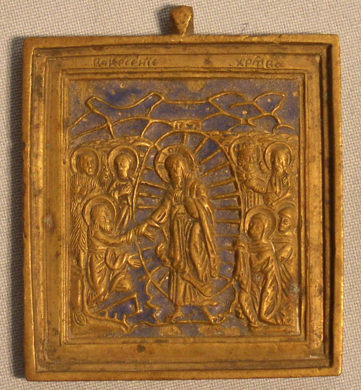 Höllenfahrt Christi.1 farbig emailliert.19.Jahrhundert.6,2x5,5cm.Zu jeder Bronze Ikone wird eine Expertise mitgeliefert.