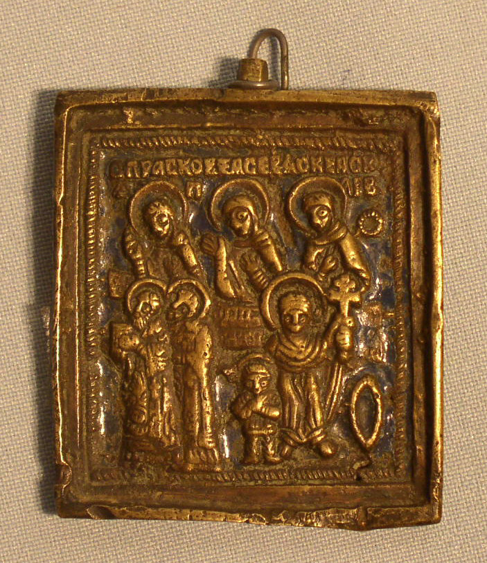 7 Heilige,darunter Julitta mit ihrem Sohn Kirik.1 farbig emailliert.19.Jahrhundert.Am unteren Rand beschädigt.5,7x4,7cm.Zu jeder Bronze Ikone wird eine Expertise mitgeliefert.