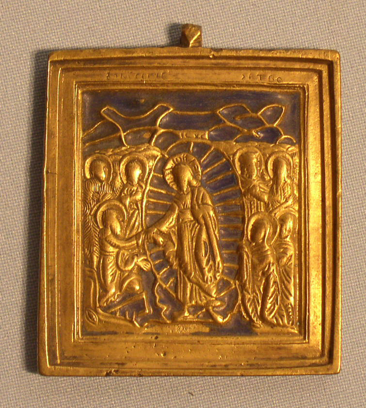 Höllenfahrt Christi.1 farbig emailliert.19.Jahrhundert.6x5,2cm.Zu jeder Bronze Ikone wird eine Expertise mitgeliefert.
