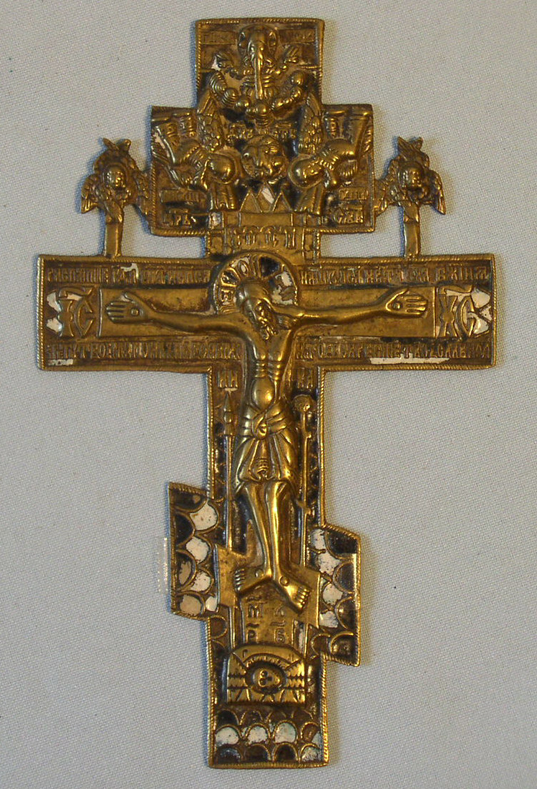 Kleines Hauskreuz.18.Jahrhundert.2 farbig emailliert.16,3x10cm.Zu jeder Bronze Ikone wird eine Expertise mitgeliefert.