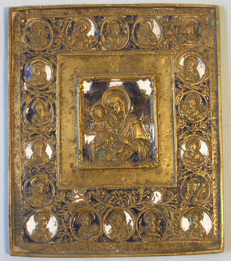 Gottesmutter Tricherusa,umrandet von der Deesis und Heiligen.Um 1800. 2 farbig emailliert.14x11,8cm.Seltenes Sammlerstück! Zu jeder Bronze Ikone wird eine Expertise mitgeliefert.