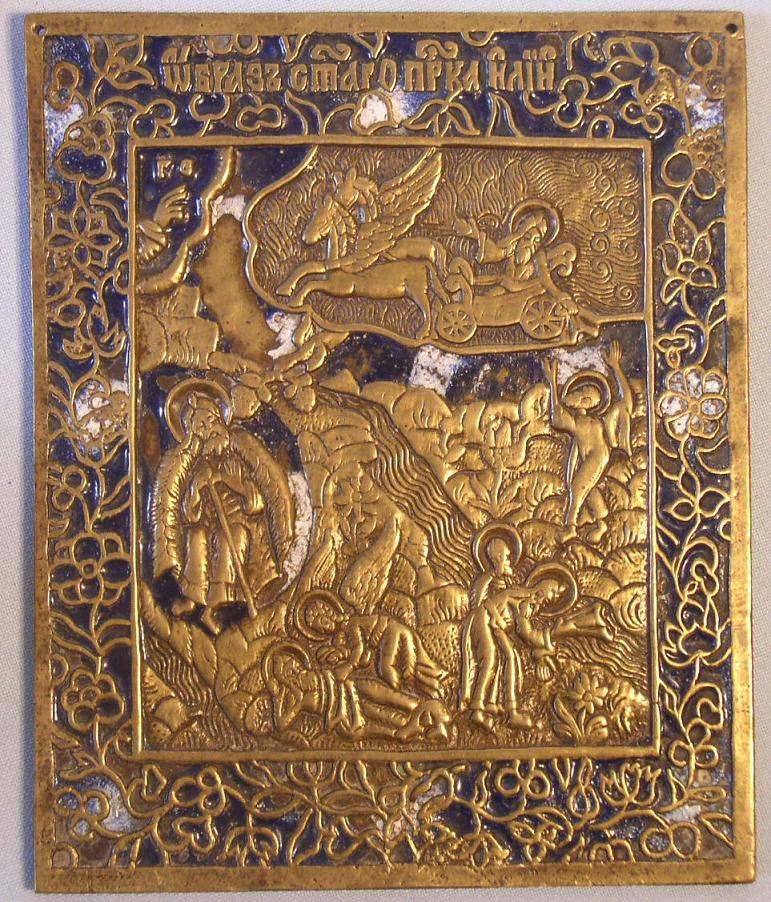 Prophet Elias mit Szenen aus seinem Leben.Um 1800. 2 farbig emailliert.Gut erhalten.14,6x12cm. Zu jeder Bronze Ikone wird eine Expertise mitgeliefert.