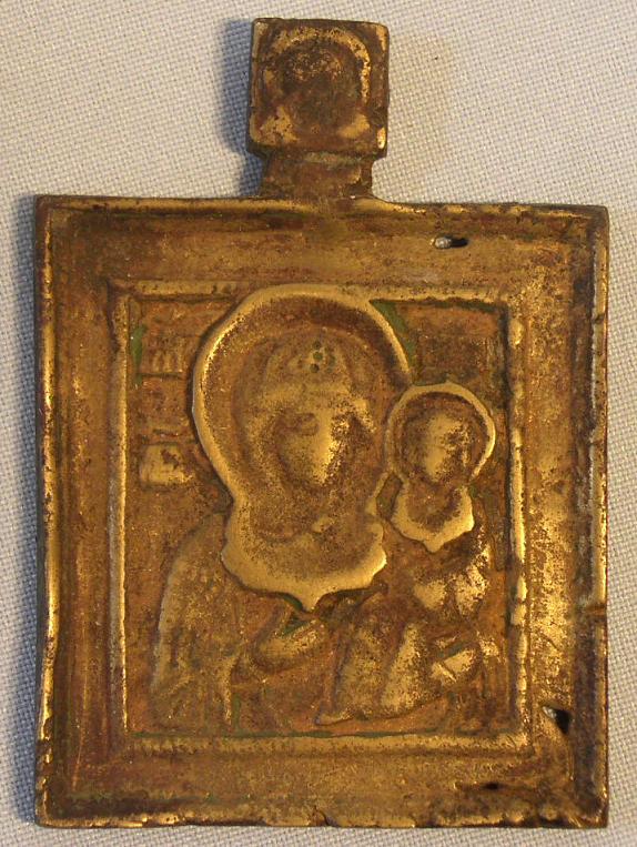Gottesmutter Hodigitria von Smolensk,darüber das Mandylion Christi.17./18.Jahrhundert.7,4x5,2cm.Kleine Gussfehler. Zu jeder Bronze Ikone wird eine Expertise mitgeliefert.