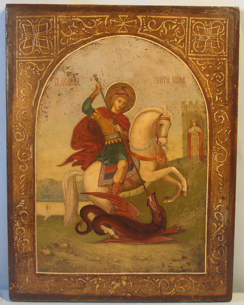 Heiliger Georg,den Drachen tötend.Russisch,um 1880-1900.Dekorative gut erhaltene Ikone.44,5x34,5cm.
