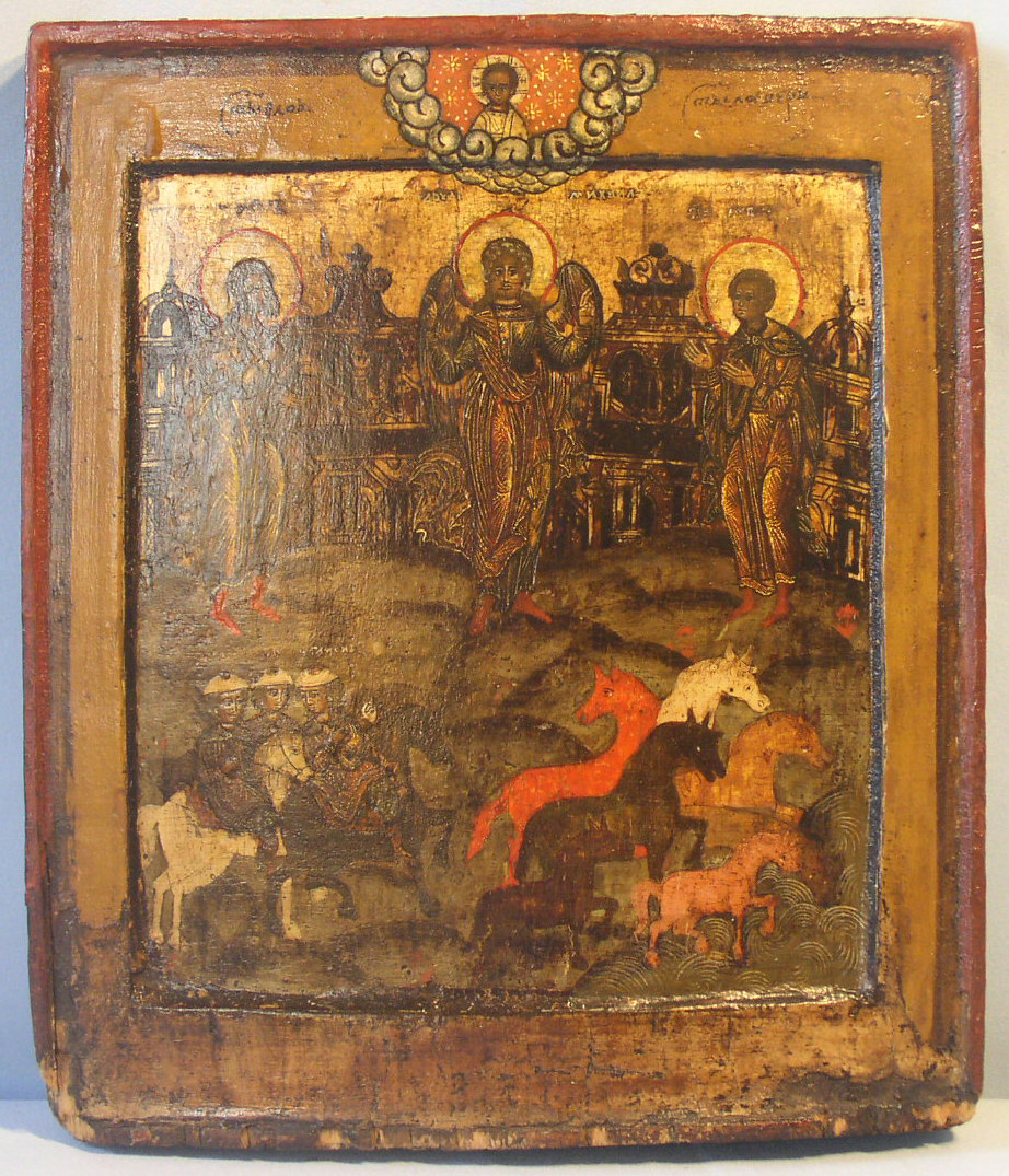 Florus und Laurus mit dem Erzengel Michael und den kappadokischen Pferdehirten.Nordrussisch,17.Jahrhundert,um 1600-1650.Minimal restauriert.31x26,6cm.Sammlerstück!