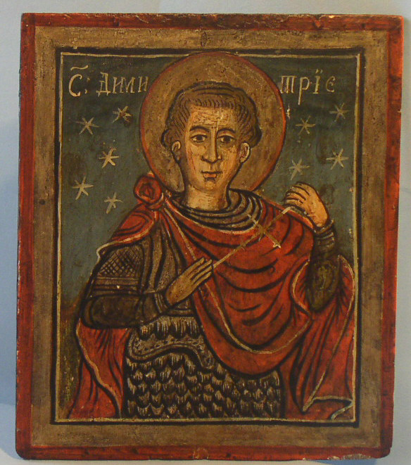 Doppelseitige Ikone,Erzengel Michael und Gabriel auf der einen Seiten,der Heilige Dimetrius auf der anderen Seite.Rumänisch,um 1800. 23x20cm.Doppelseitige Ikonen sind sehr selten!