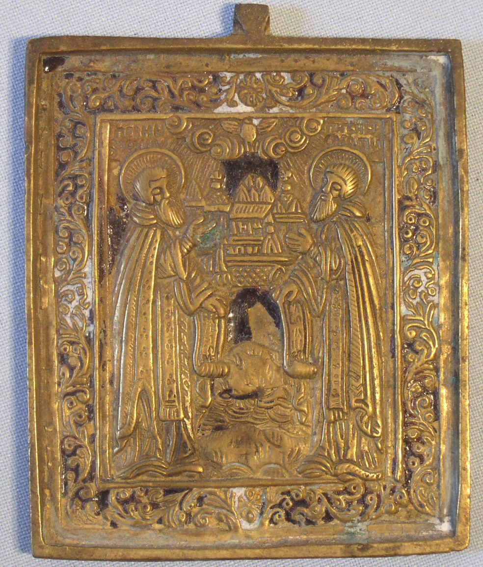 Zosima und Sawwatij mit Kloster.2 farbig emailliert.19.Jahrhundert.9x7,2cm. Zu jeder Bronze Ikone wird einen Expertise mitgeliefert.