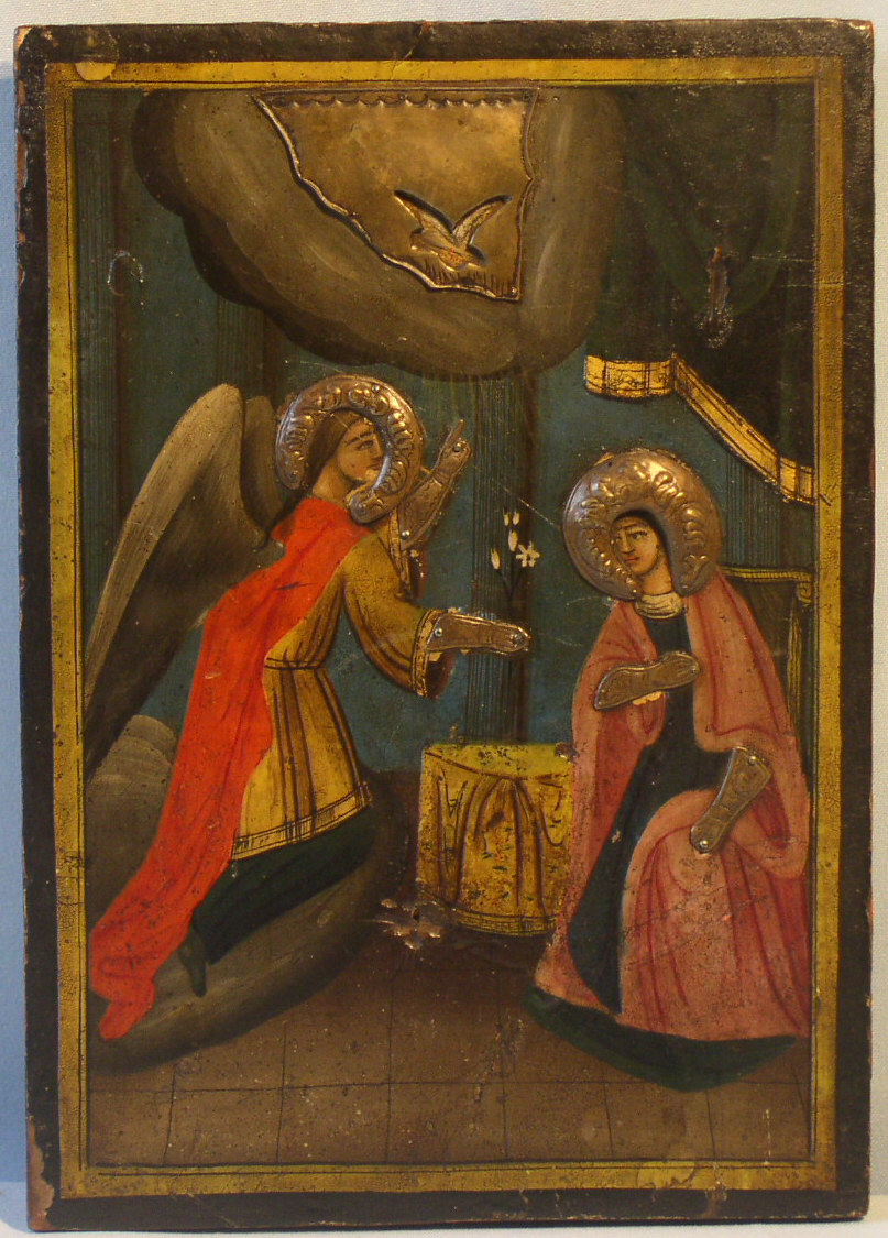 Verkündigung an die Gottesmutter.Griechisch,19.Jahrhundert.24x17cm.Seltene originale Silberbeschläge.Ungewöhnliche,seltene Ikone.